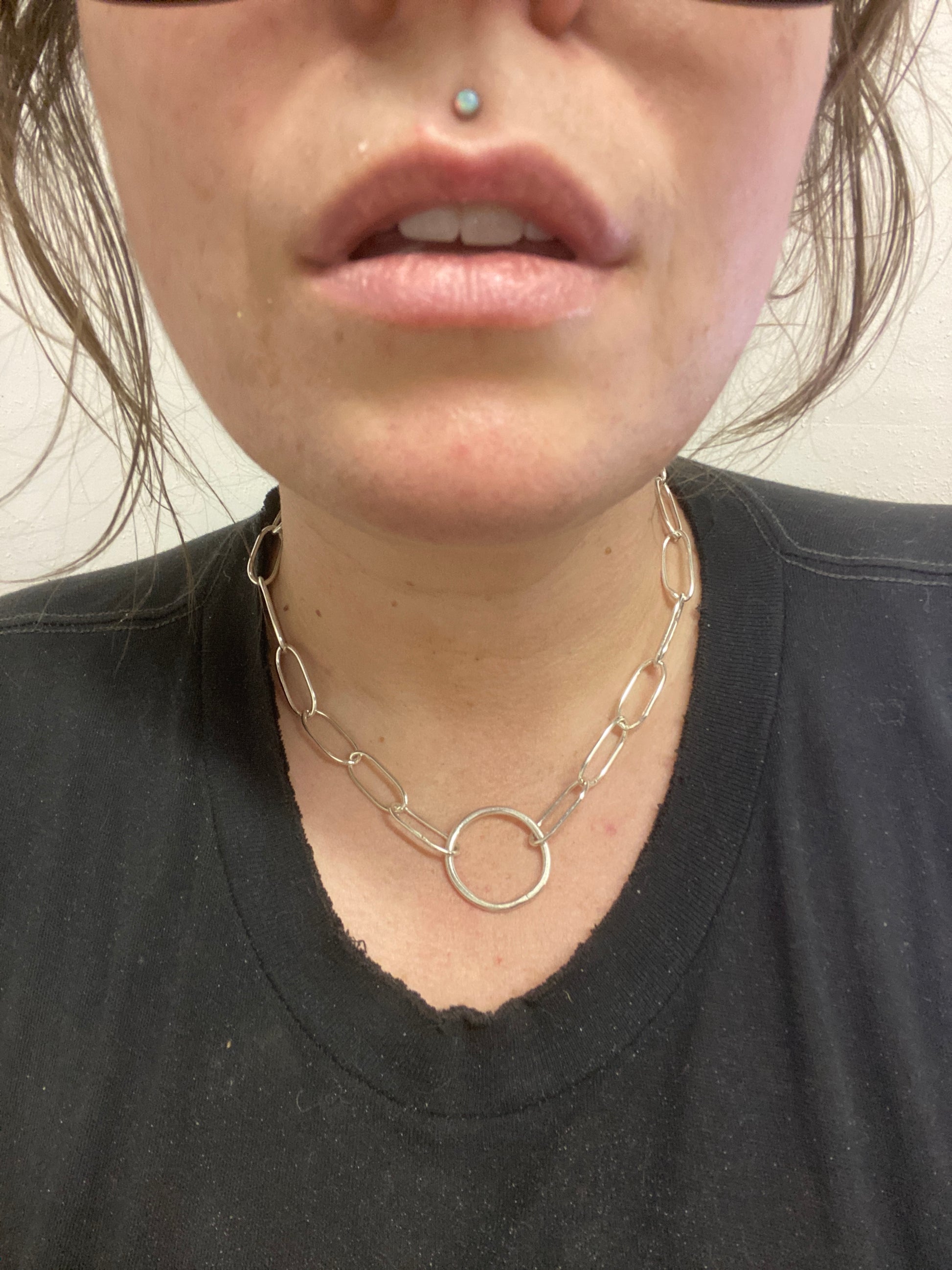 This isn’t your dainty chain. Hand-forged from thick 14g sterling silver, each link carries weight and attitude. A solid 10g O-ring sits front and center, built to hook on charms or stand alone as a bold statement. At 18”, this chain is chunky, raw, and meant to be seen.