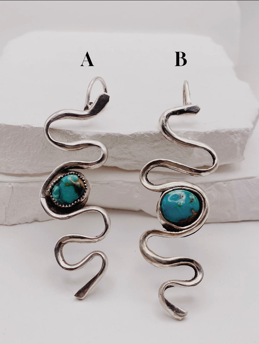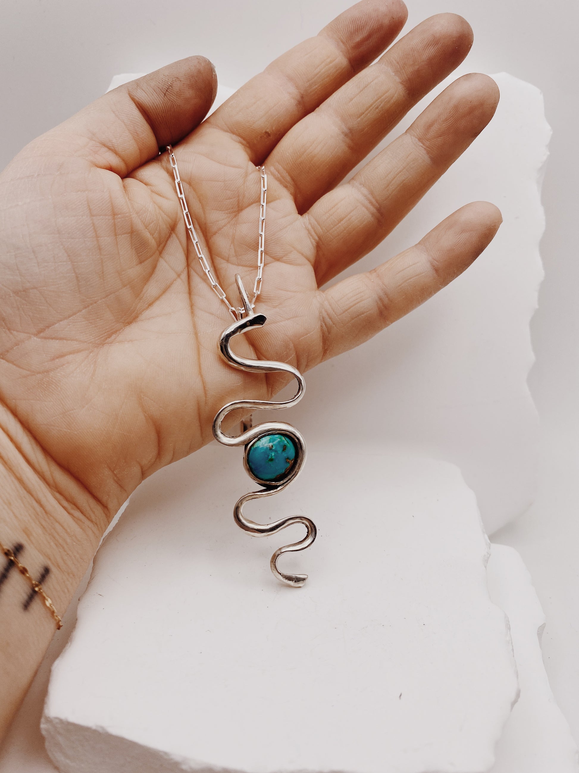 Hand formed sterling silver serpent encases a piece of Sierra Bella turquoise, on a paper link chain.